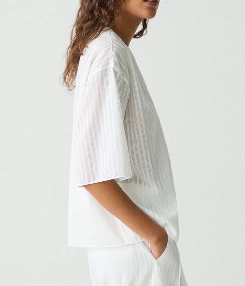 Theory セオリー Linear Cotton OS Boxy Tee ブラウス シャツ トップス ストライプ 五分袖 半袖 オーバーサイズ コットン ホワイト 白 透け感 レディース