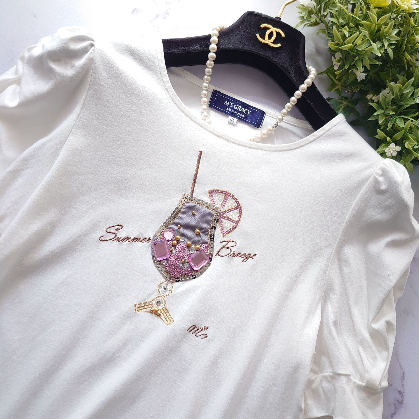 M'S GRACY エムズグレイシー 刺繍 ビジュー モチーフ付きのカットソー 半袖Tシャツ 五分袖 パフスリーブ 38 M 白 ホワイト×ピンク カクテル ジュース スパンコール ラインストーン トップス ブラウス クルーネック プルオーバー レディース