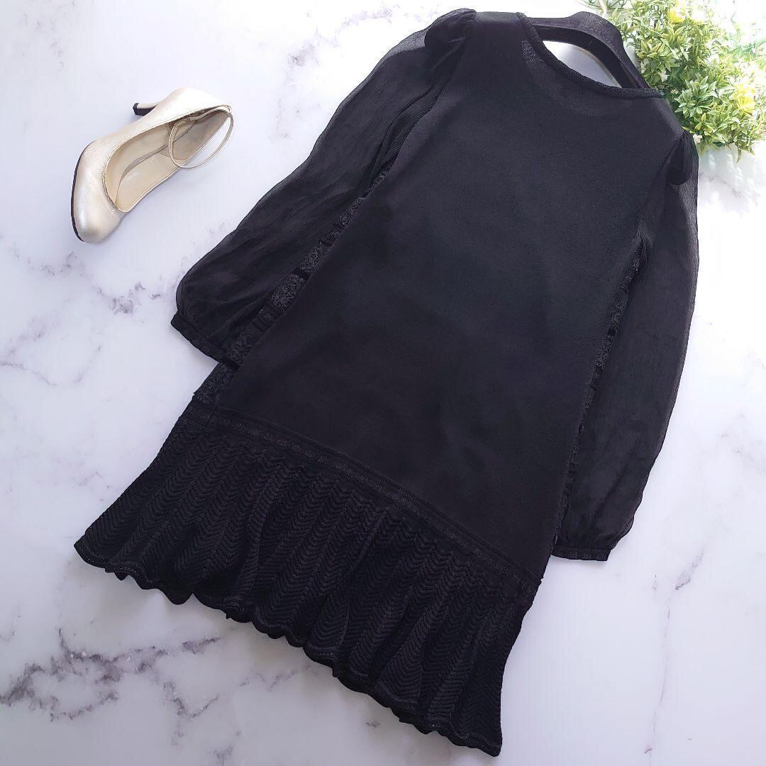 EPOCA エポカ レース ワンピース シースルー シアー ベルベット ベロア プリーツ フリル 長袖 サイズ40 M 黒 ブラック 膝丈 クルーネック ストレッチ ロング プルオーバー レディース